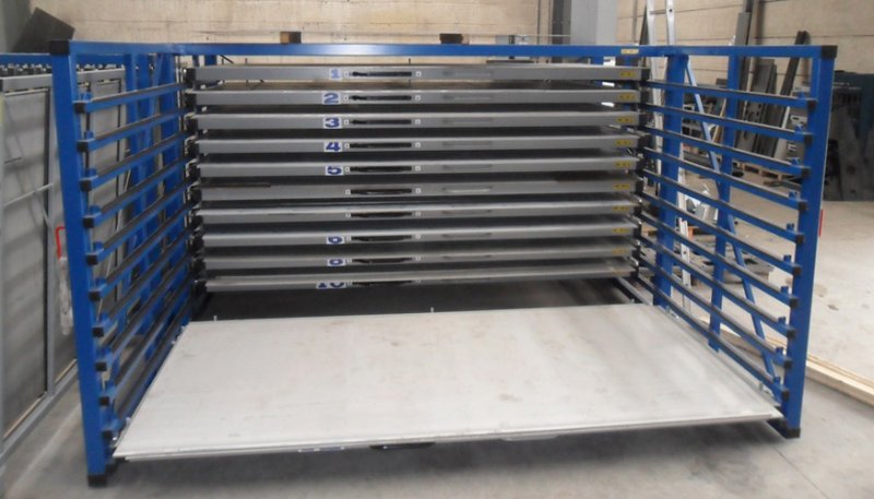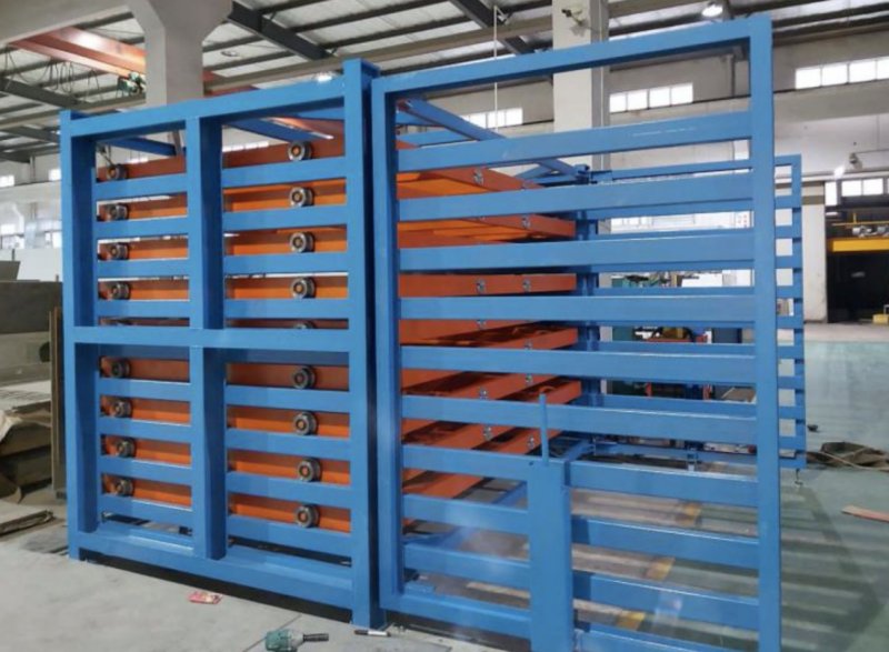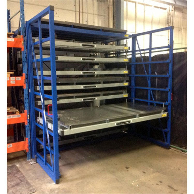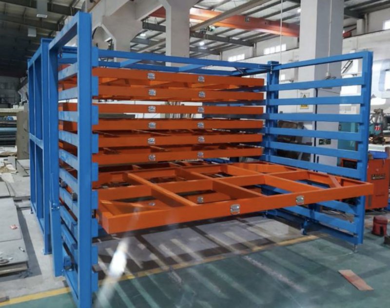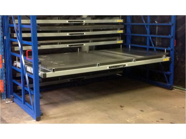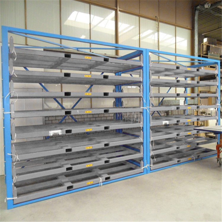 大型板材存放貨架帶有自動移動框的移動式貨架緊湊,方便定位金屬板位置,移動框架帶有滑輪和搖臂,選好目標板材之后移動懸臂即可創(chuàng)造空間獲取板材。移動框架固定在兩條平行軌道上,通過移動框架,人員方可進入空擋獲取金屬板是一種簡單安全的搬運方法。